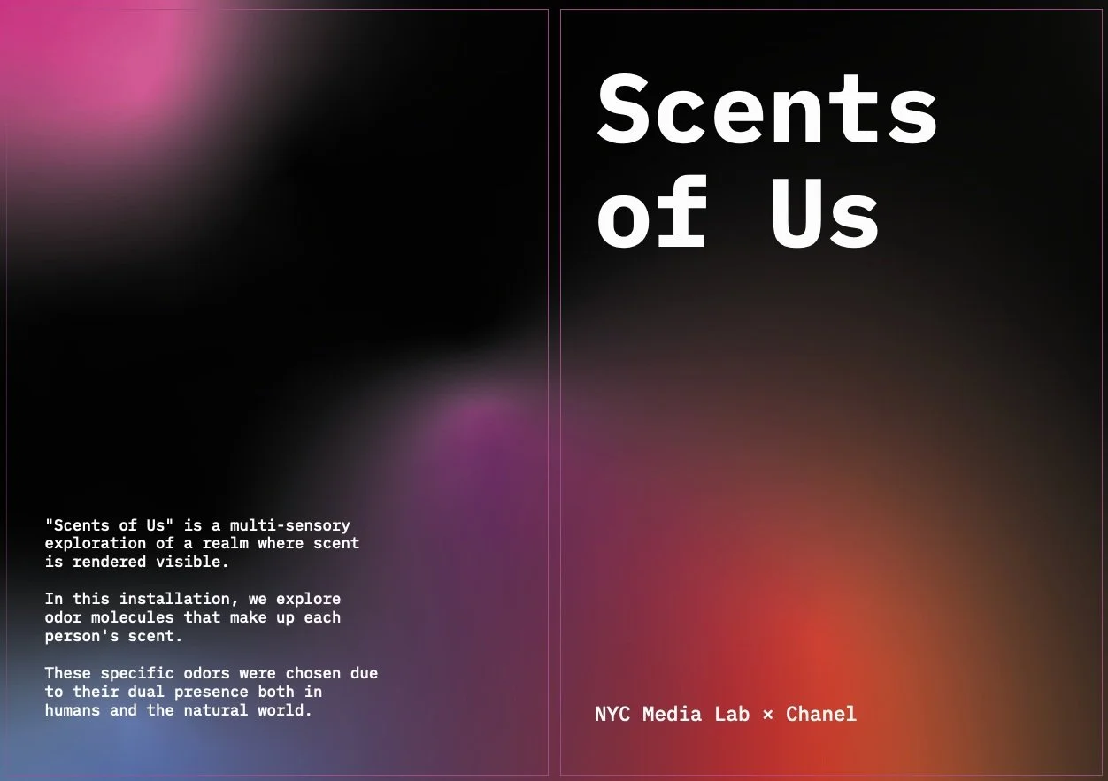 In response to the NYC Media Lab and CHANEL’s 2024 Virtual Synesthesia Challenge, "Scents of Us" emerged as a groundbreaking installation designed to answer a bold question: How can one leverage scent and synesthesia to tell a story in bold new ways? This immersive work, created by the Scentience team—Vince Picone, M Dougherty, Adnan Aga, Una Zhang, and Shuang Cai—invites participants into a sensory dialogue where the unseen world of scent becomes vividly tangible. By blending analog fragrances with digital visuals and sound, it transforms olfaction into a dynamic, personal narrative. Honored with the Innovation Award at the Challenge’s Showcase on March 5, 2024, "Scents of Us" captivated audiences and judges alike with its pioneering approach.